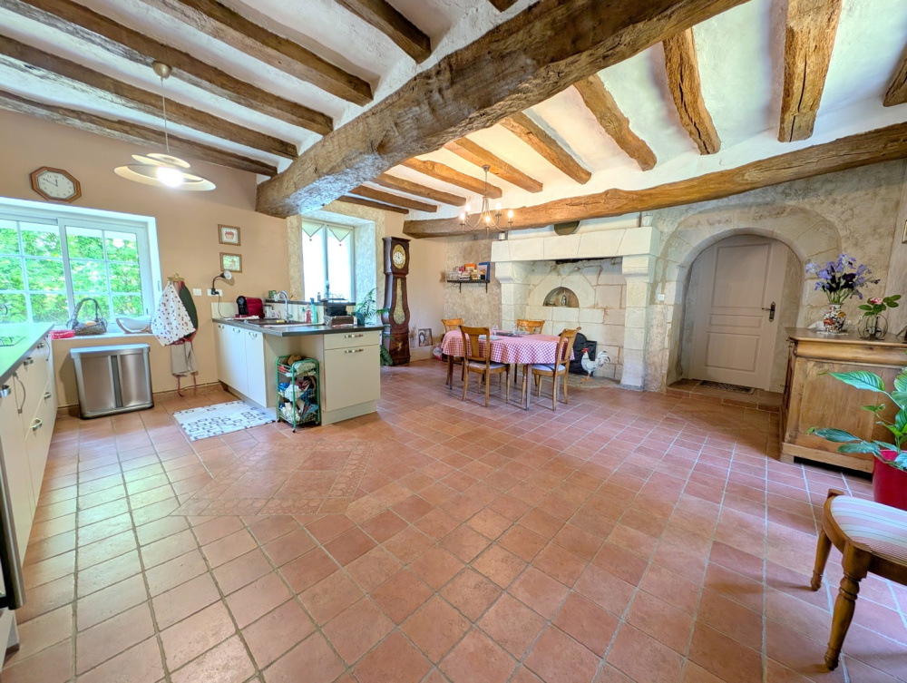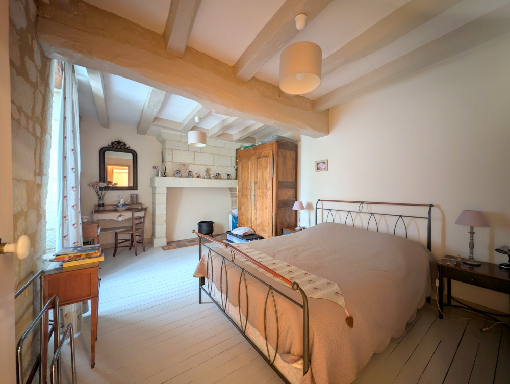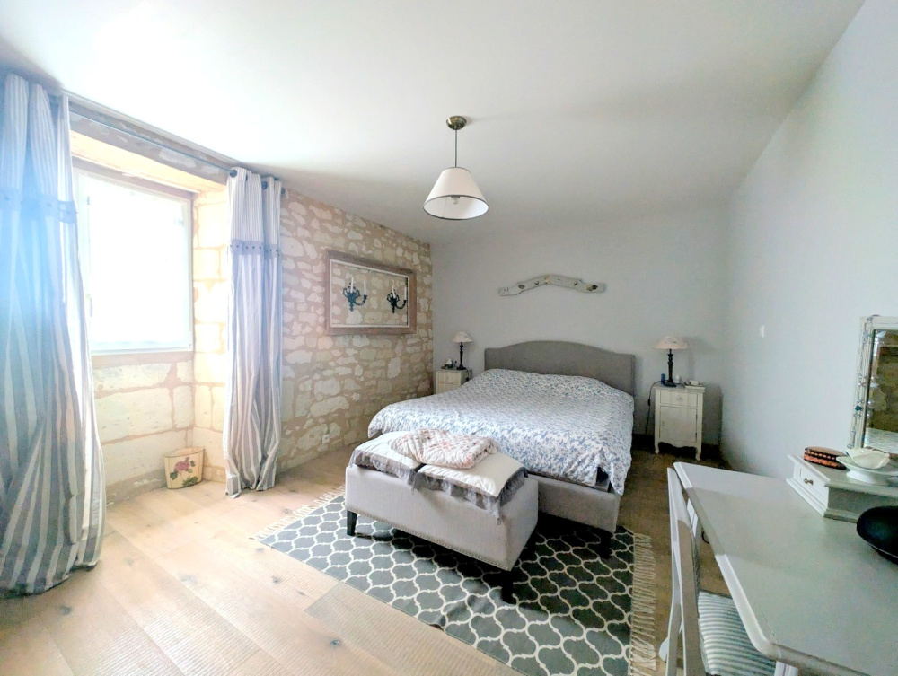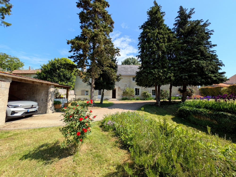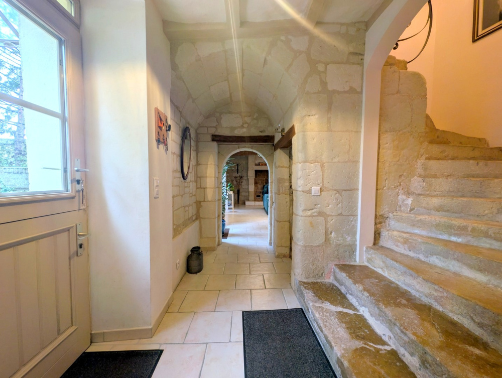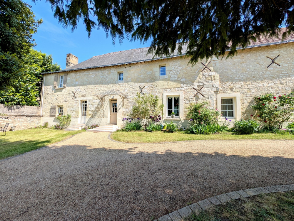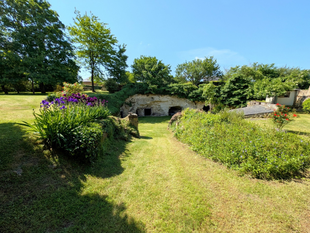 Magnifique longère en pierre entièrement rénovée, 185 m² habitables, offrant entrée avec escalier en pierre, spacieuse cuisine de 36m², beau séjour-salon de 37m² avec cheminée cathédrale et pierres apparentes, buanderie, 5 chambres dont suite parentale au rez-de-chaussée, 2ème salle de bains, 3 wc. Dépendances, préau, puits avec pompe, beau site troglodyte, sur joli terrain paysager de 2570m². L'installation d'une pompe à chaleur permettrait d'obtenir un DPE en C 155. Assainissement aux normes. Belles prestations !