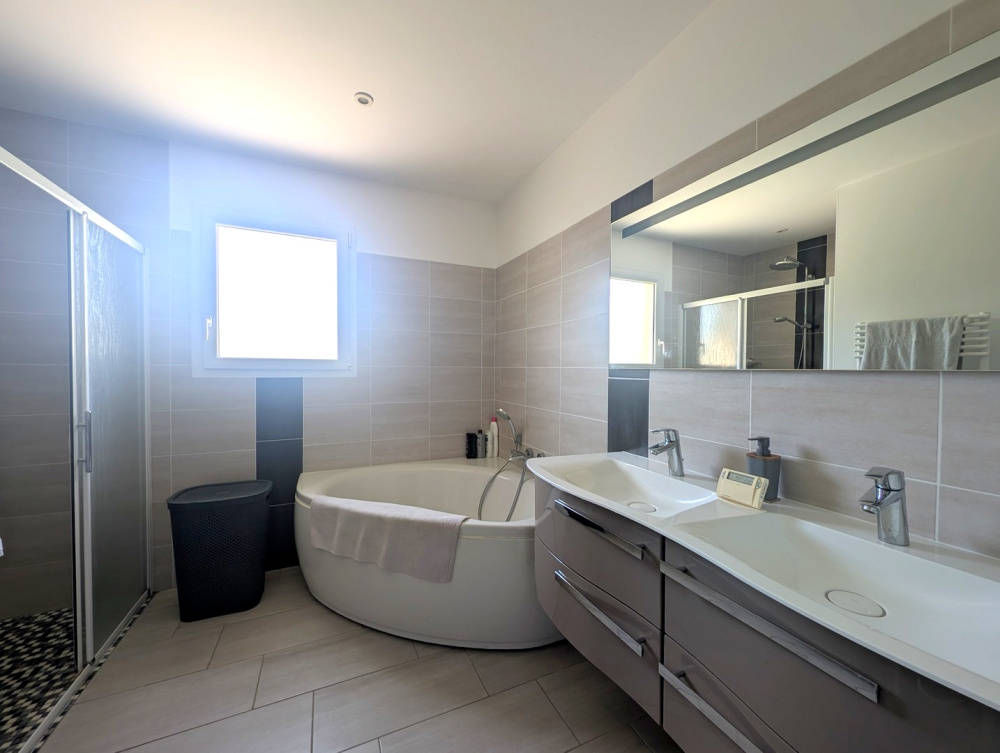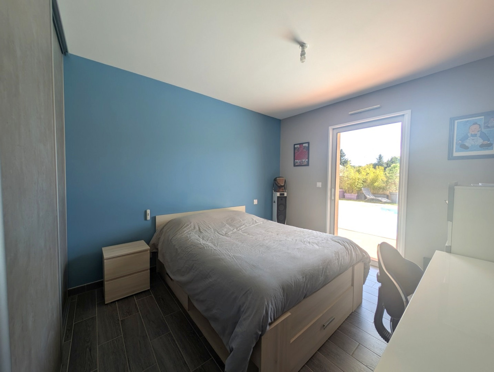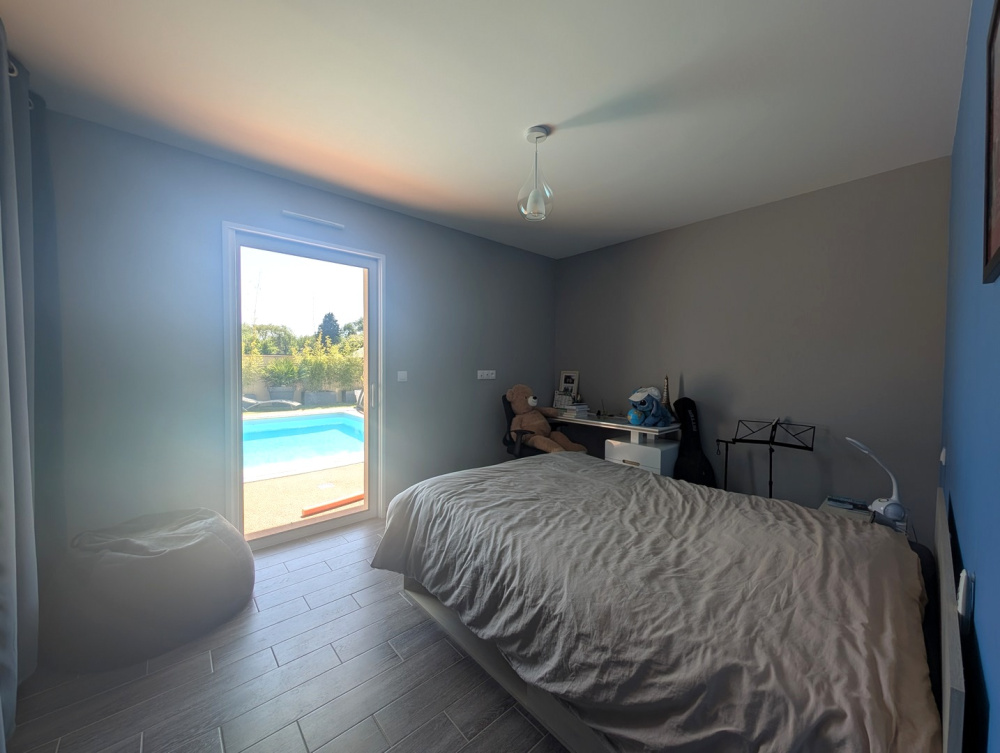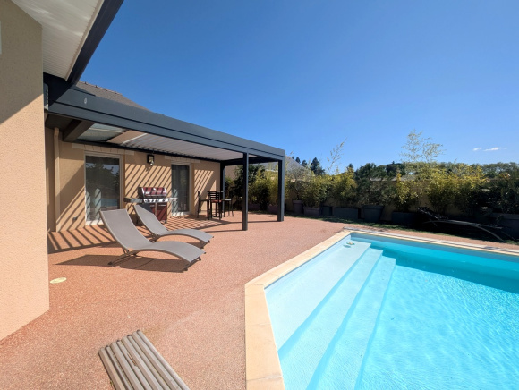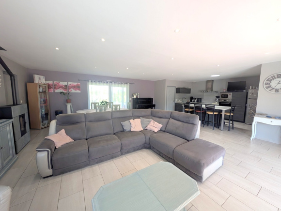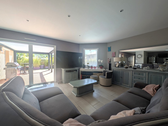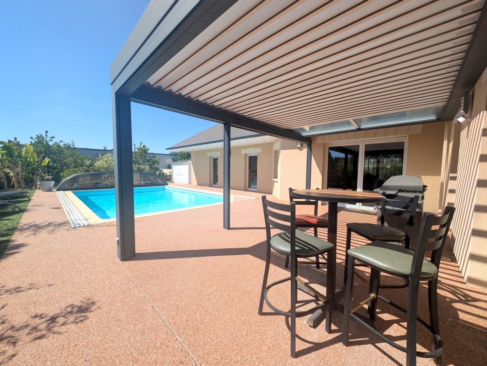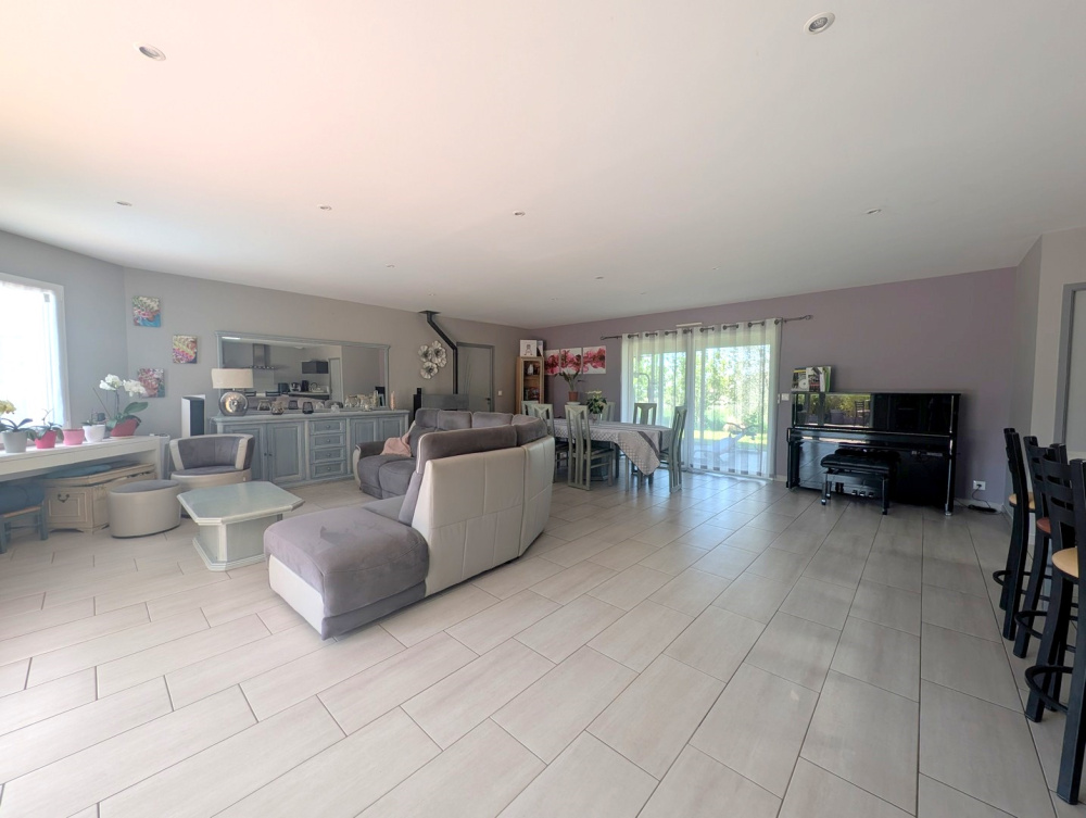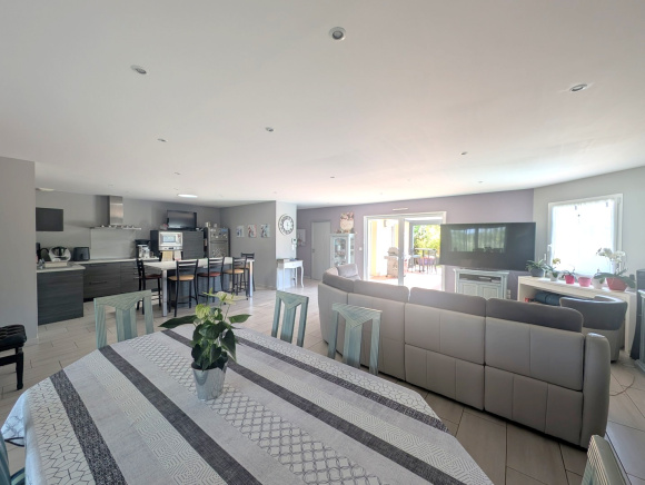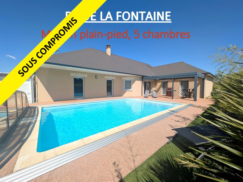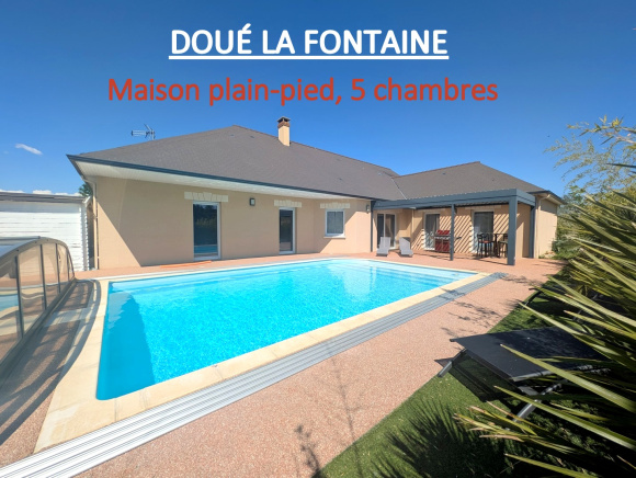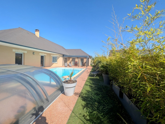 Beau pavillon récent de plain-pied, 177m² habitables, offrant entrée avec nombreux rangements, belle pièce de vie de 63m² avec cuisine aménagée et poêle à granulés neuf, bureau, 5 chambres dont suite parentale avec grand dressing et salle d'eau privative, 2ème salle de bains, lingerie. Terrasse avec pergola bioclimatique, piscine 8mx5m avec nage à contre-courant et abri de piscine téléscopique, terrasse couverte et fermée avec baies vitrées, grand garage double de 70m² avec grenier de stockage, sur charmant terrain paysager de 1650m² avec puits. BELLES PRESTATIONS !