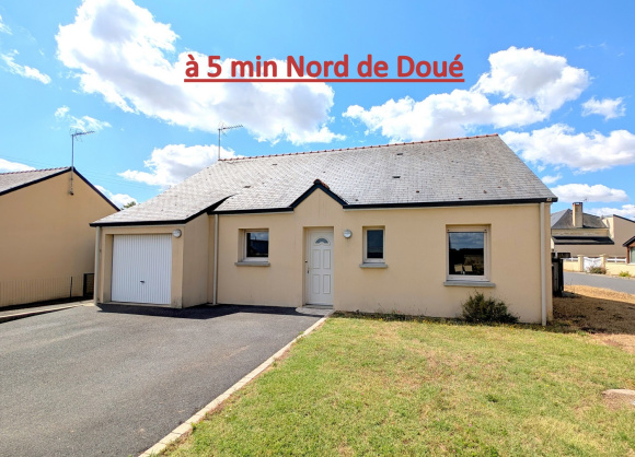 A 5 minutes de DOUÉ, Charmant pavillon de plain-pied, de 2004, offrant pièce de vie lumineuse de 40 m² avec cuisine aménagée, couloir desservant trois chambres, salle de bains, W.C. Garage attenant, sur terrain de 475m². Tout-à-l'égoût. A visiter !
